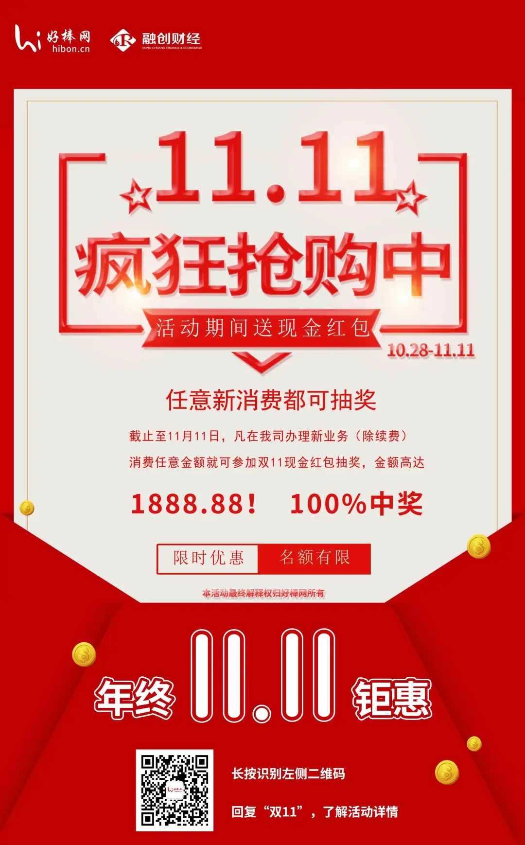 凡在我司辦理新業(yè)務(wù),消費任意金額,可參加雙11現金紅包抽獎。金額高達1888.88元,100%中獎!