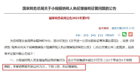 3月31日,稅務(wù)局正式發(fā)文,明確了小規模納稅人增值稅起征點(diǎn)從月銷(xiāo)售額10萬(wàn)元提高到15萬(wàn)元,季度銷(xiāo)售額未超過(guò)45萬(wàn)元的,免征增值稅。